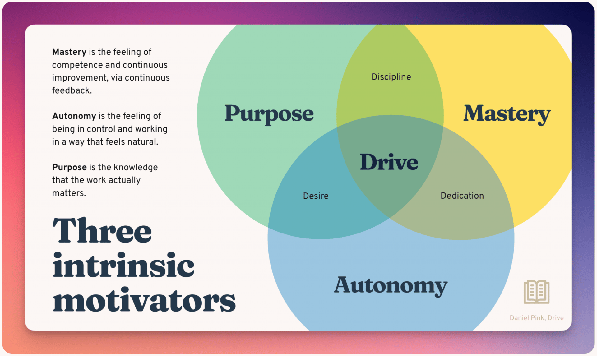 Author Dan Pink, in his influential book Drive, identifies three key drivers that fuel deep engagement and high performance: autonomy, mastery, and purpose.